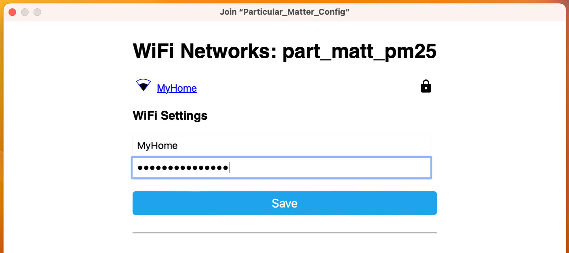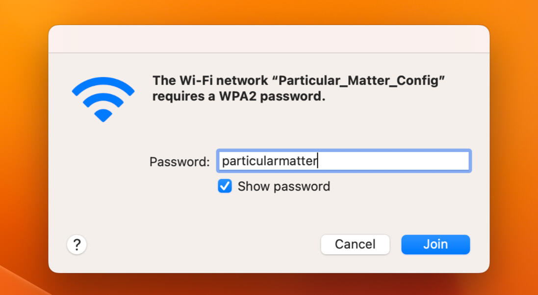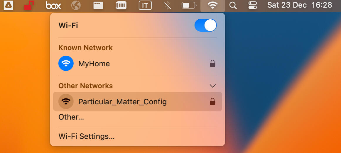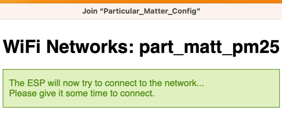 After 20 seconds the Particular Matter Config access point will appear in the list of WiFi networks